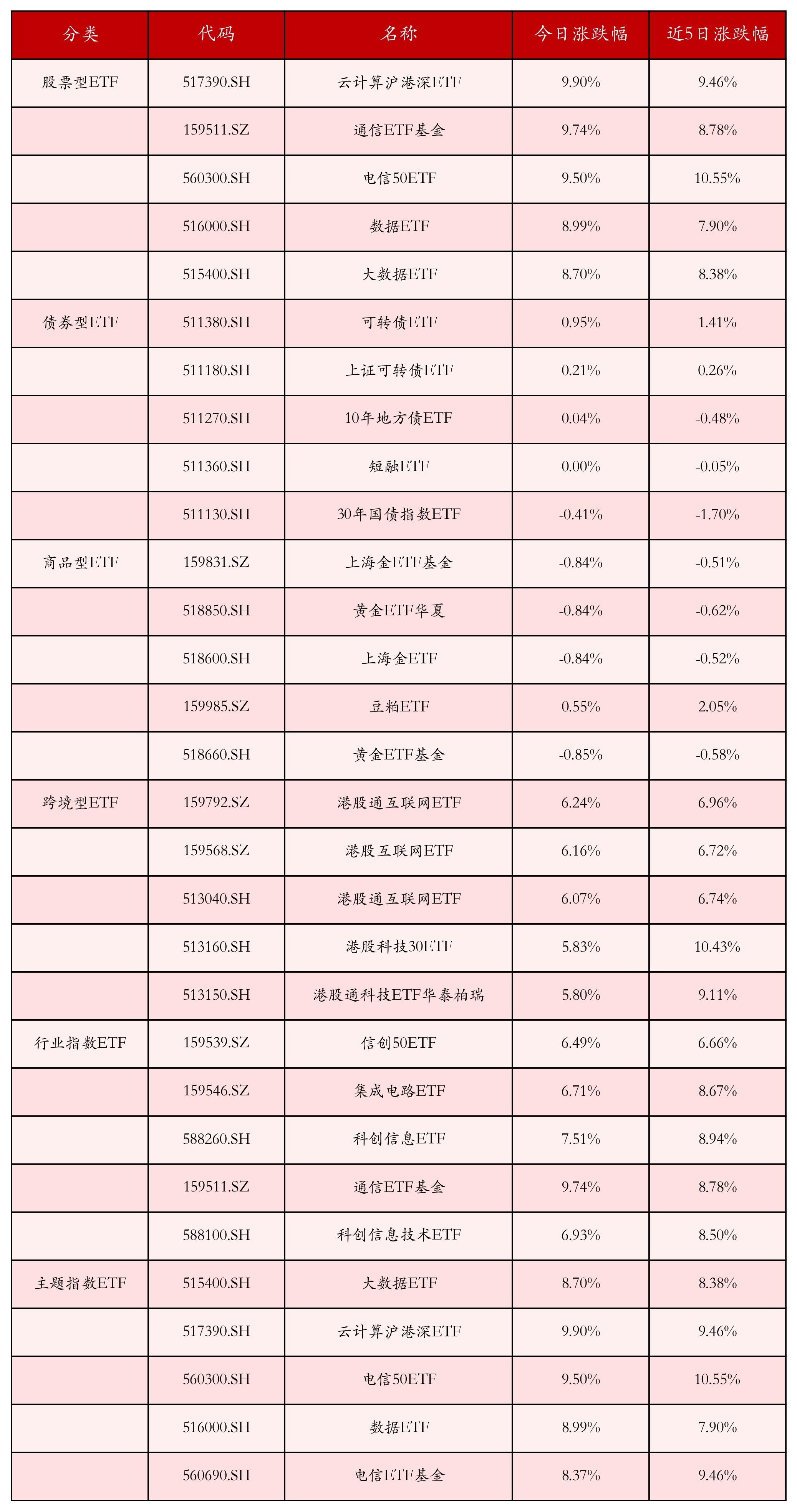 从不同投资种类、行业、主题的ETF产品中找出今日走势行情排名前5的ETF基金,今日涨幅靠前的ETF产品如下表所示。股票型ETF中涨跌幅排名前3位的ETF产品分别为云计算沪港深ETF(517390.SH)、通信ETF基金(159511.SZ)和电信50ETF(560300.SH),今日收益率分别为9.90%、9.74%和9.50%。