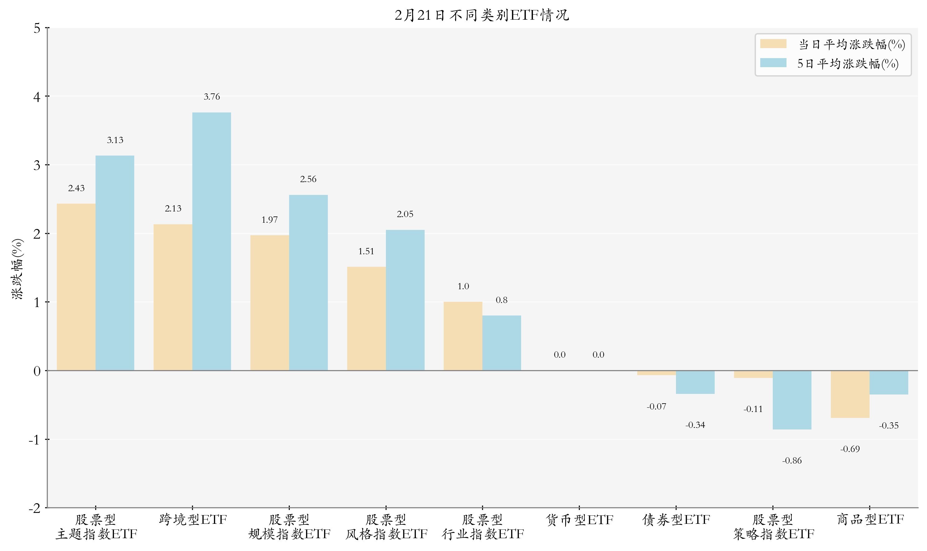 根据ETF基金的投资范围,将ETF基金划分为股票型规模指数ETF、股票型行业指数ETF、股票型策略指数ETF、股票型风格指数ETF、股票型主题指数ETF、债券型ETF、商品型ETF、货币型ETF、跨境ETF,今日股票型主题指数ETF表现最优,该类ETF的平均涨跌幅为2.43%;商品型ETF的表现最差,该类ETF的平均涨跌幅为-0.69%。