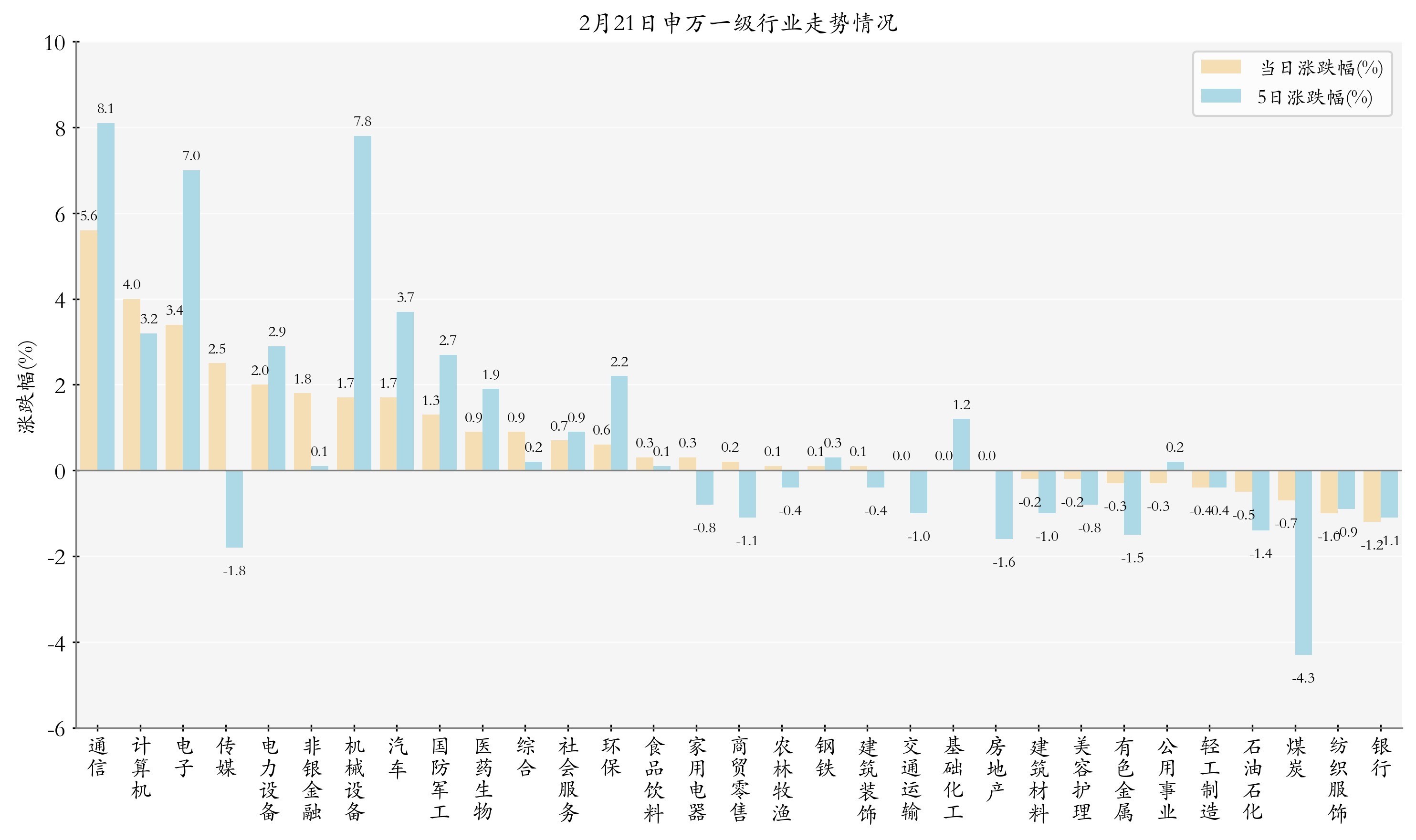 1. 三大指数全线上涨,AI板块全面爆发今日(2月21日),三大指数全线上涨,上证指数涨0.85%,深证成指涨1.82%,创业板指涨2.51%。多只AI板块ETF大涨,云计算沪港深ETF(517390)涨9.90%,通信ETF基金(159511)涨9.74%,电信50ETF(560300)涨9.50%,数据ETF(516000)涨8.99%。