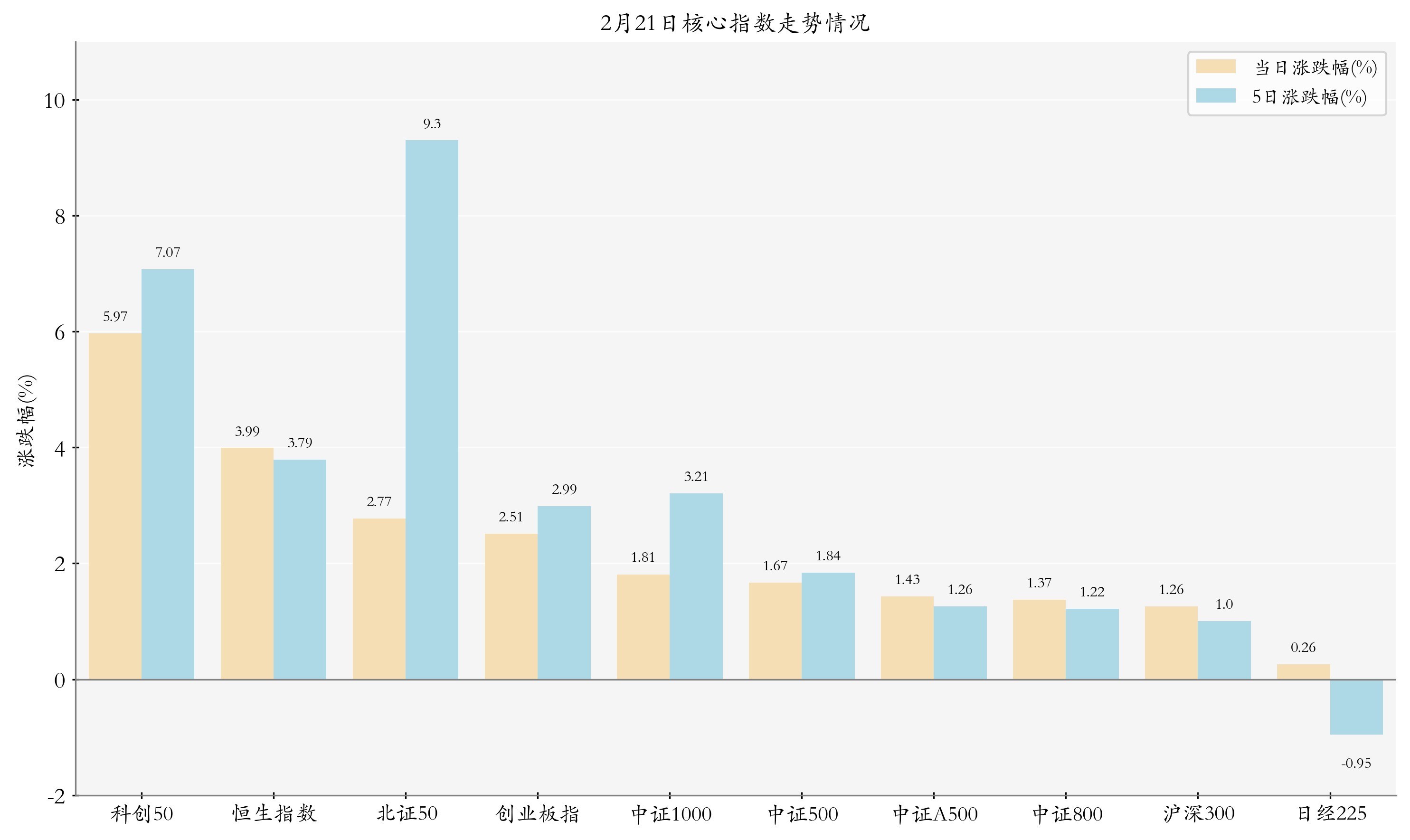 二、今日行情速览1. 指数走势统计A股与海外主要核心指数走势,今日(2月21日,下同)三大指数集体上涨,其中上证指数上涨0.85%,收于3379.11点,日内最高3381.06点;深证成指上涨1.82%,收于10991.37点,日内最高11003.95点;创业板指上涨2.51%,收于2281.51点,日内最高2284.04点。今日科创50、恒生指数与北证50走势排名靠前,日涨跌幅分别为5.97%、3.99%与2.77%;近5个交易日北证50、科创50与恒生指数的走势排名靠前,近5日涨跌幅分别为9.3%、7.07%与3.79%。