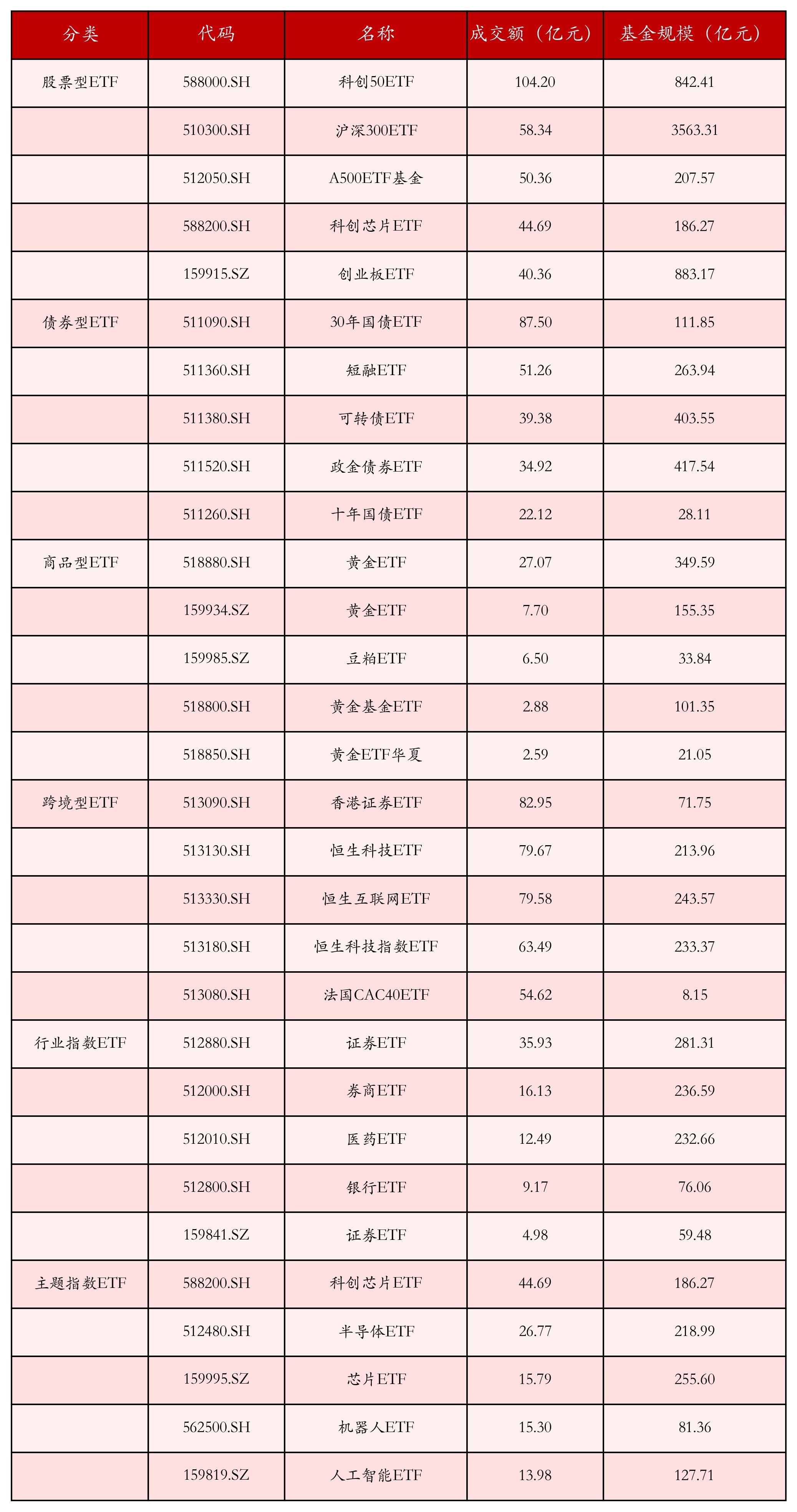 基于成交额对各类ETF今日的成交情况进行统计,成交额靠前的ETF产品如下表所示。股票型ETF中成交额排名前3位的ETF产品分别为沪深300ETF(510300.SH)、A500ETF基金(512050.SH)和科创芯片ETF(588200.SH),今日成交额分别为58.34亿元、50.36亿元和44.69亿元。